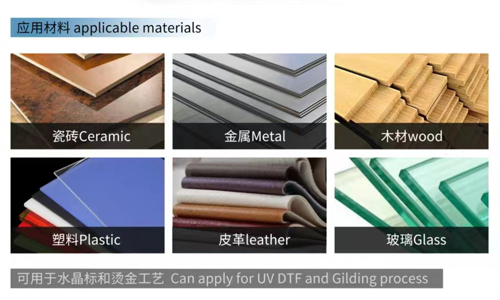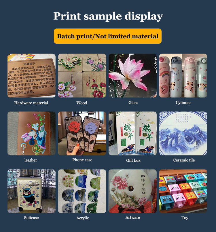 UV-Druckanwendungsmaterialien: PVC, reflektierende Folie, Leinwand, Teppich, Leder, Glas, Keramikfliesen, Metall, Decke, Aluminium, Holz, Tür, Acrylplatte, Plexiglasplatte, Schaumstoffplatte, Wellpappe usw.